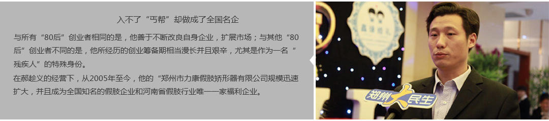 鄭州市力康假肢矯形器有限公司(簡(jiǎn)稱(chēng)力康),是一家專(zhuān)業(yè)從事假肢矯形器的設(shè)計(jì)、研發(fā)、制作及裝 配的專(zhuān)業(yè)機(jī)構(gòu)。成立于1992年是河南省唯一一家福利企業(yè)。力康下設(shè)業(yè)務(wù)部、技術(shù)部、住院部、康復(fù) 部、售后服務(wù)部,并配有現(xiàn)代化的裝配車(chē)間和功能齊全的訓(xùn)練大廳,為殘疾朋友康復(fù)訓(xùn)練提供了可靠 保障。總經(jīng)理穿戴假肢多年,有著豐富的臨床經(jīng)驗(yàn)和親身體會(huì);多年來(lái),力康已為全國(guó)幾十萬(wàn)名殘疾 朋友安裝上舒適、美觀(guān)、耐用的假肢和矯形器具,使他們更大限度地恢復(fù)了正常的工作和生活。“產(chǎn) 品即人品”的質(zhì)量理念、先進(jìn)的技術(shù)、實(shí)惠的價(jià)格、完善的售后服務(wù)是力康取勝的法寶……